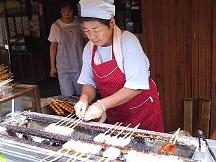 有名な何とか餅(すいません、来月チェックします)を焼い いてますこのお餅はいつも午前中人が並んで買うそうです。名前わかんないので写真アップで載せときますね。